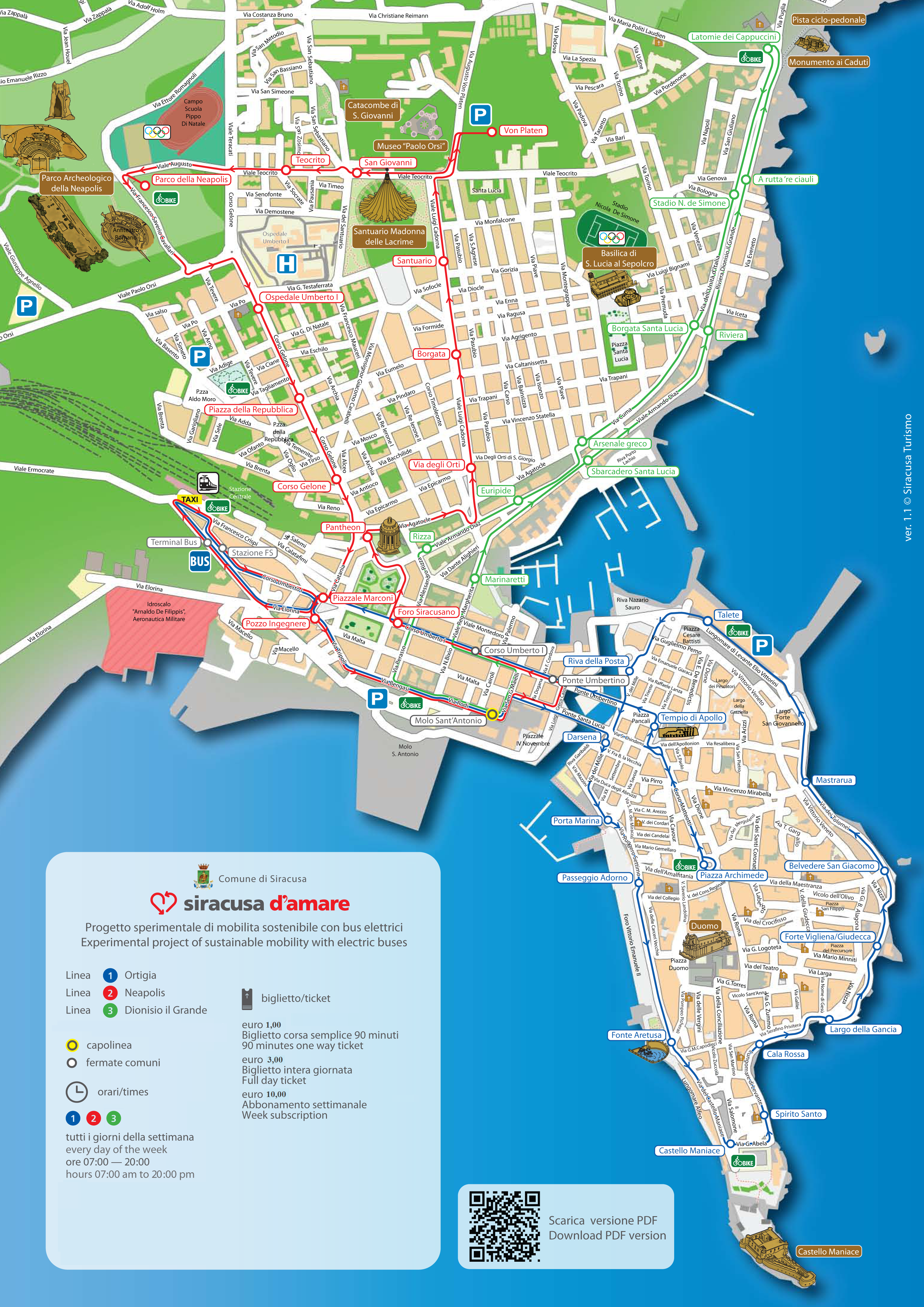 In Syracuse you can use public transportation. Electric buses, called “Siracusa d’Amare”, are available (bus ticket 1€@90 minute)