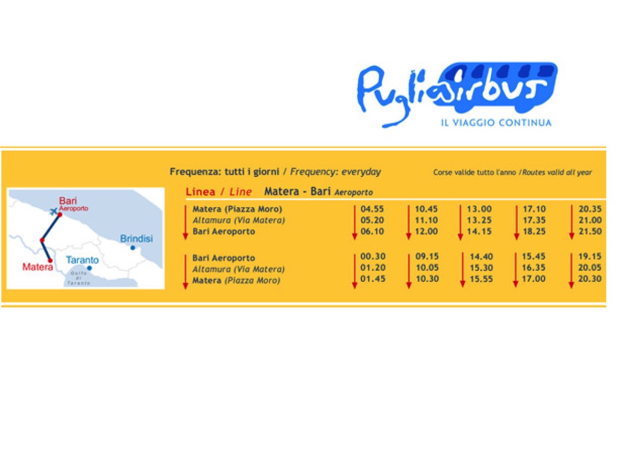The Bari-Palese airport is connected every day to Matera by buses of Puglia-airbus. The timetable can be found here