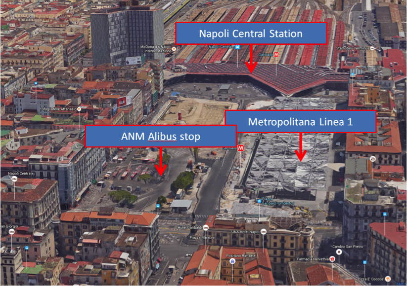 From the Naples International Airport (Capidichino, NAP) you should take a bus (ANM Alibus), connecting Naples Airport to “Piazza Garibaldi – Main Train Station” (first stop, see the pictures below). Its frequency is 25 minutes more or less from 6:00 a.m. to 11:40 p.m.