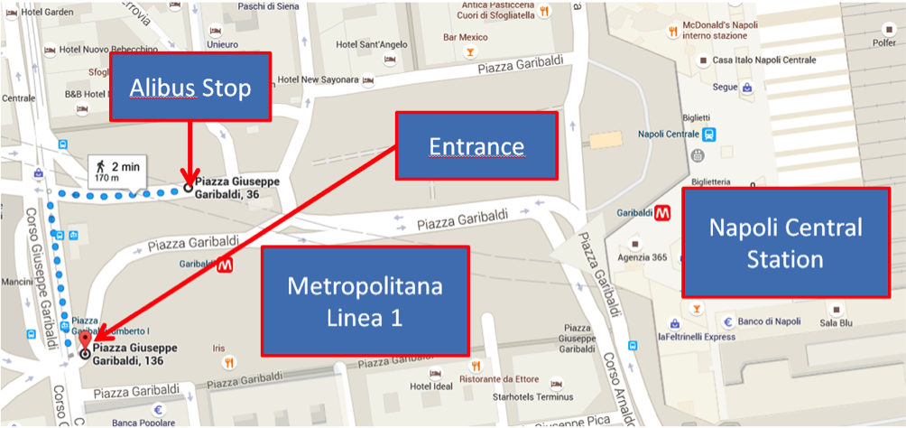 You will arrive by train to the Napoli Central Station (Piazza Garibaldi, see the above pictures). You can follow the indications inside the train station to reach the “Linea 1 – Garibaldi Station” of the Metro (there is an underground tunnel that connects the Napoli Central Station to the Linea 1 – Garibaldi Station of the Metro). Once arrived at the Garibaldi Station, take the Metro, direction “Piscinola”, and get off at “Università Station”. Then follow the indication in the section below: To the Conference Center.