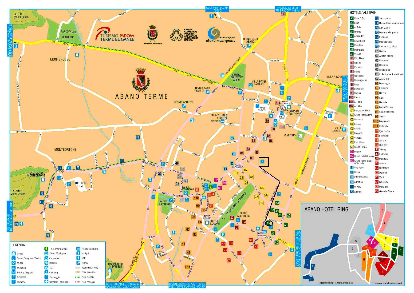 Abano can be reached by car on the A4 Milano-Venezia Motorway, exit “Padova ovest”, then take the bypass west (Corso Australia) until the turn-off for Abano. Follow the provincial road that takes you from Padua to Abano and after 4 km you will reach the thermal centre. For those who arrive from the A13 motorway (Bologna-Padua) take the “Terme Euganee” exit, then follow the SS Adriatica towards Padua and at the Mezzavia cross-road turn left. After the underpass continue towards Abano.