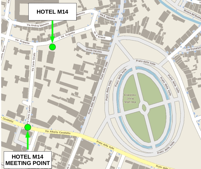 For participants lodging at Hotel M14: leaving the hotel, turn on the left and then on the first road on the left (Via Carlo Cerato). You will reach Via Cavalletto, cross the road on the pedestrian strikes, you will find a bus stop.