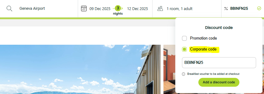 La prenotazione prevede l'inserimento di un codice sconto fornito dall'Hotel nella sezione "Discount code", selezionando "Corporate code" durante la prenotazione della stanza (illustrato nell'immagine). Il codice deve essere inserito dopo aver indicato le date di pernottamento, che vanno dal 9 al 12 dicembre.