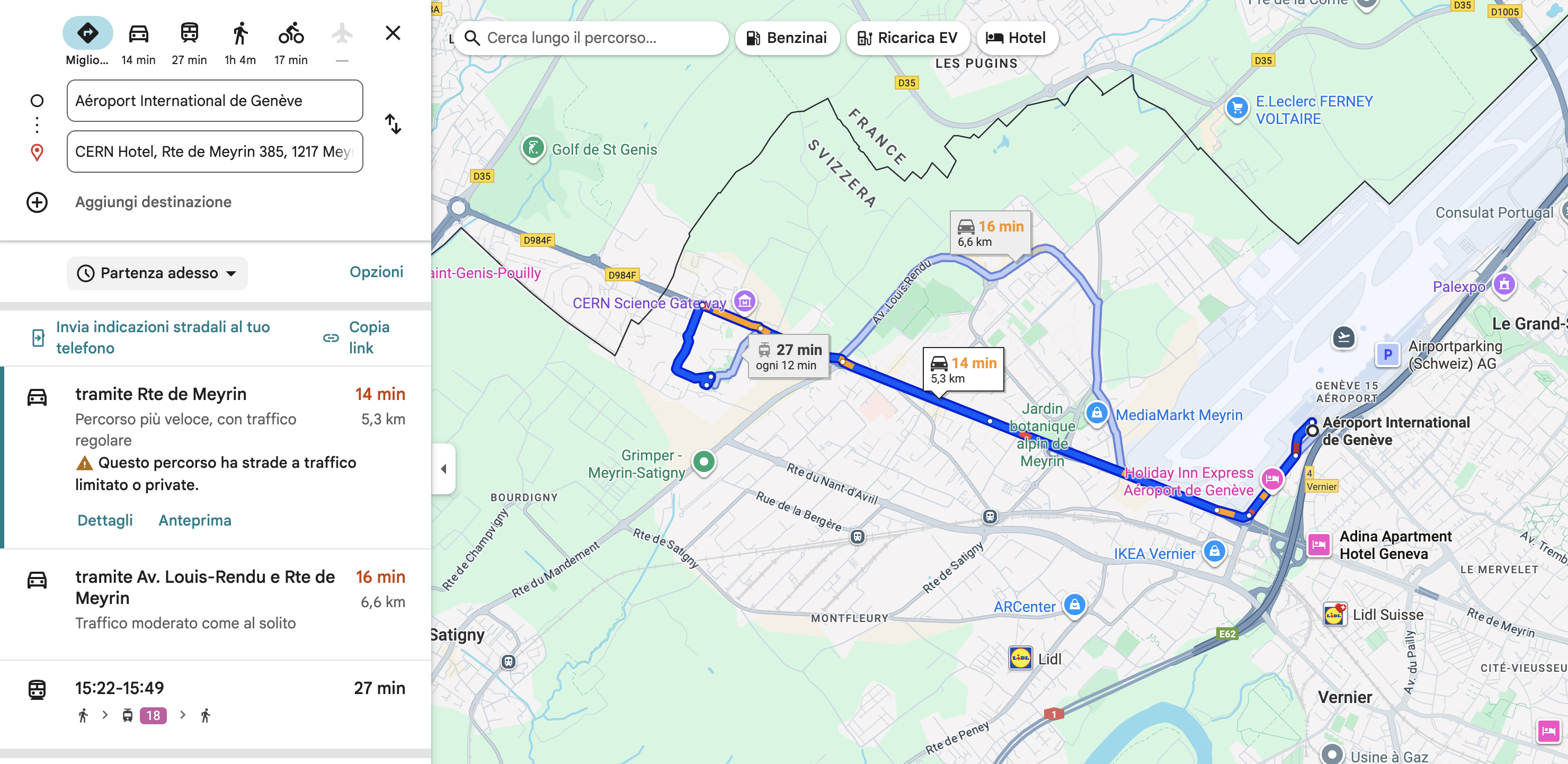 La soluzione più rapida ed efficiente per spostarsi dall'Aeroporto di Ginevra (GVA) al CERN (per chi pernotta presso il Foyer) è utilizzare i mezzi pubblici.