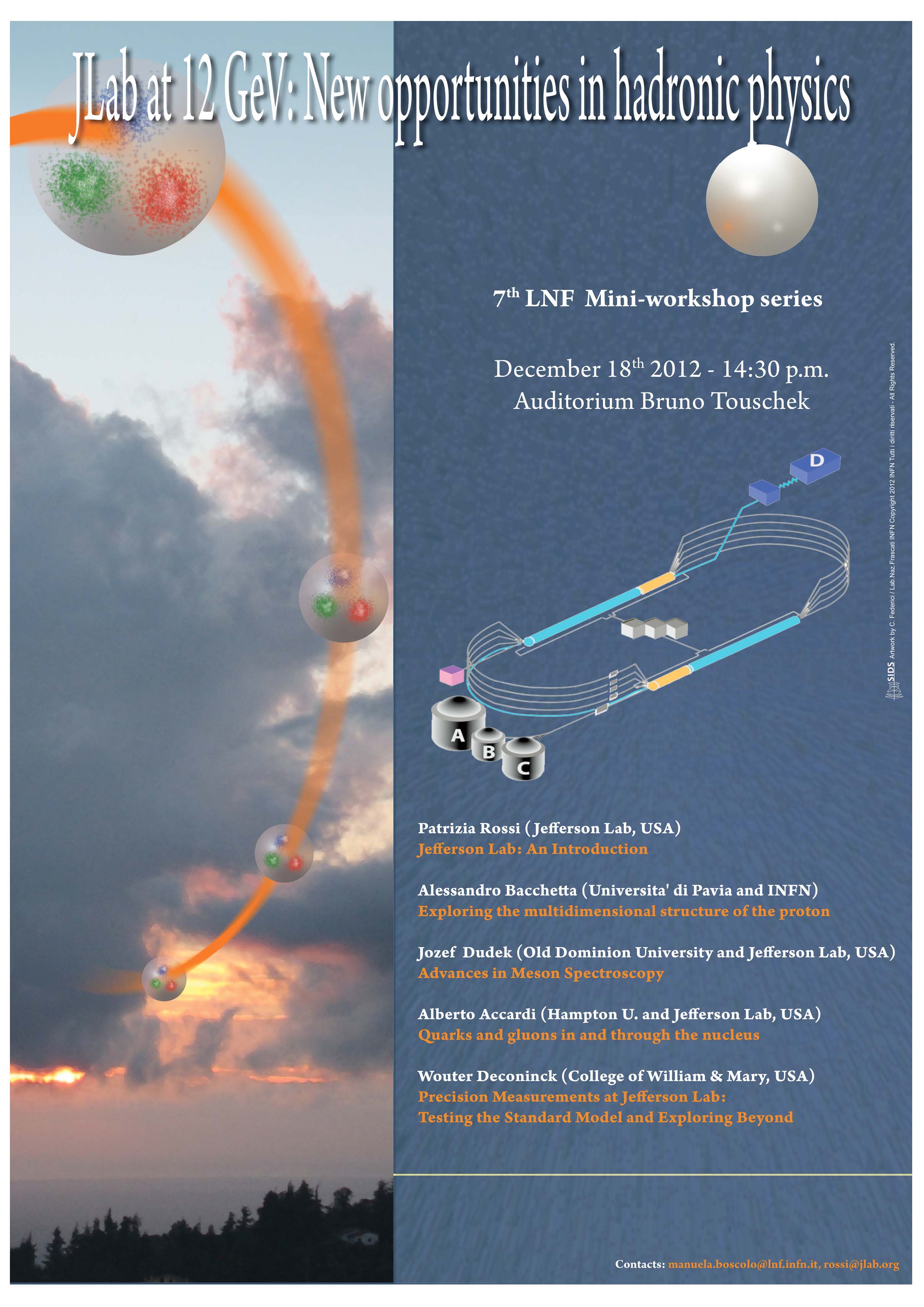 Il meeting segue il Mini-workshop "JLAB at 12 GeV: New opportunities in hadron physics" - LNF, 18 dicembre 2012 - organizzato da Patrizia Rossi, ove verranno presentate da speakers "esterni" le tematiche di fisica nelle quali la Collaborazione JLab12 e' impegnata.