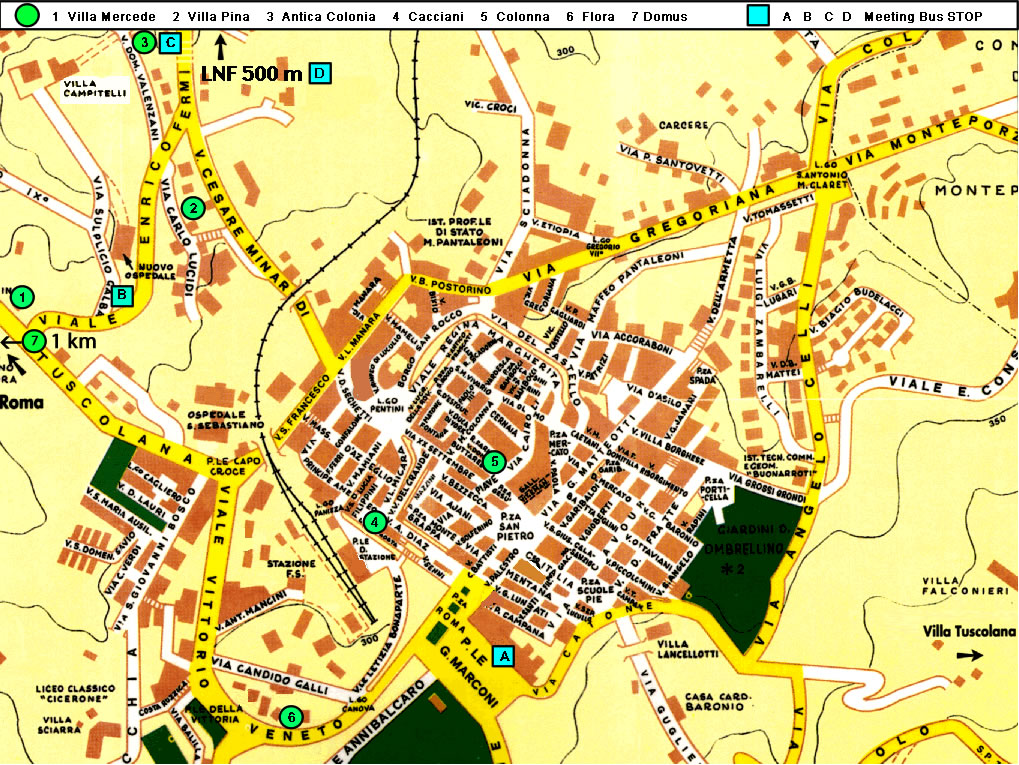 A bus service will be provided during the meeting days to link the LNF to the hotels and to the centre of Frascati, in due time for the beginning and the end of the daily program. See the Frascati map and the bus timetable below.