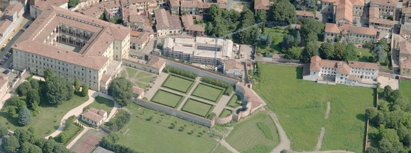 Il Collegio Borromeo (a sinistra) con gli orti borromaici e la palazzina della Sezione Laureati (a destra).